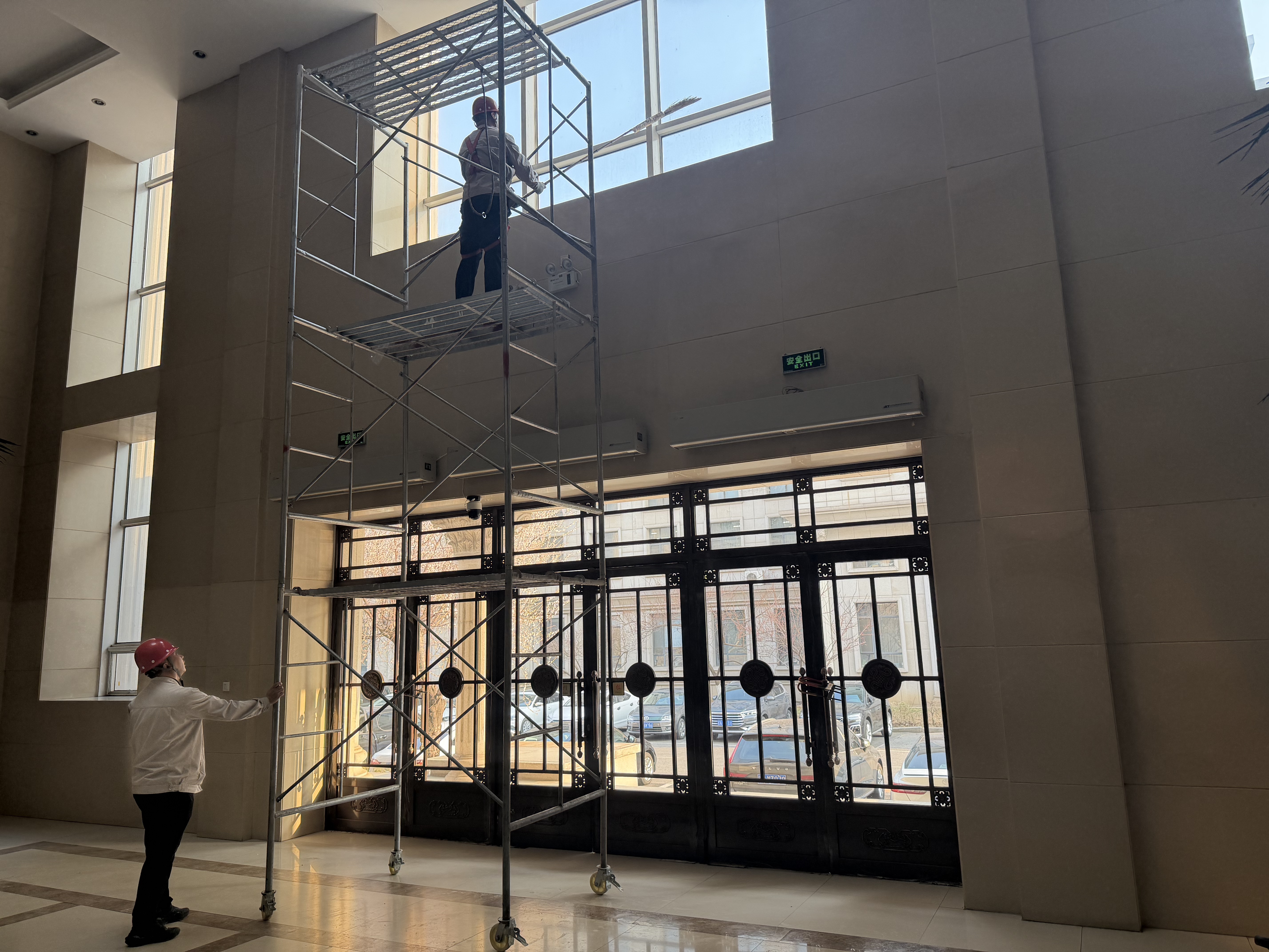 針對挑高墻面、高空玻璃等日常清潔難以覆蓋的區(qū)域,工作人員搭建移動腳手架,佩戴安全防護裝備,使用專業(yè)清潔工具對墻面污漬、玻璃浮塵進行徹底清理。地面區(qū)域同步進行深度拖洗、污漬清除,不放過任何衛(wèi)生死角,以細致入微的作業(yè)標準對公共區(qū)域進行全方位“大掃除”。